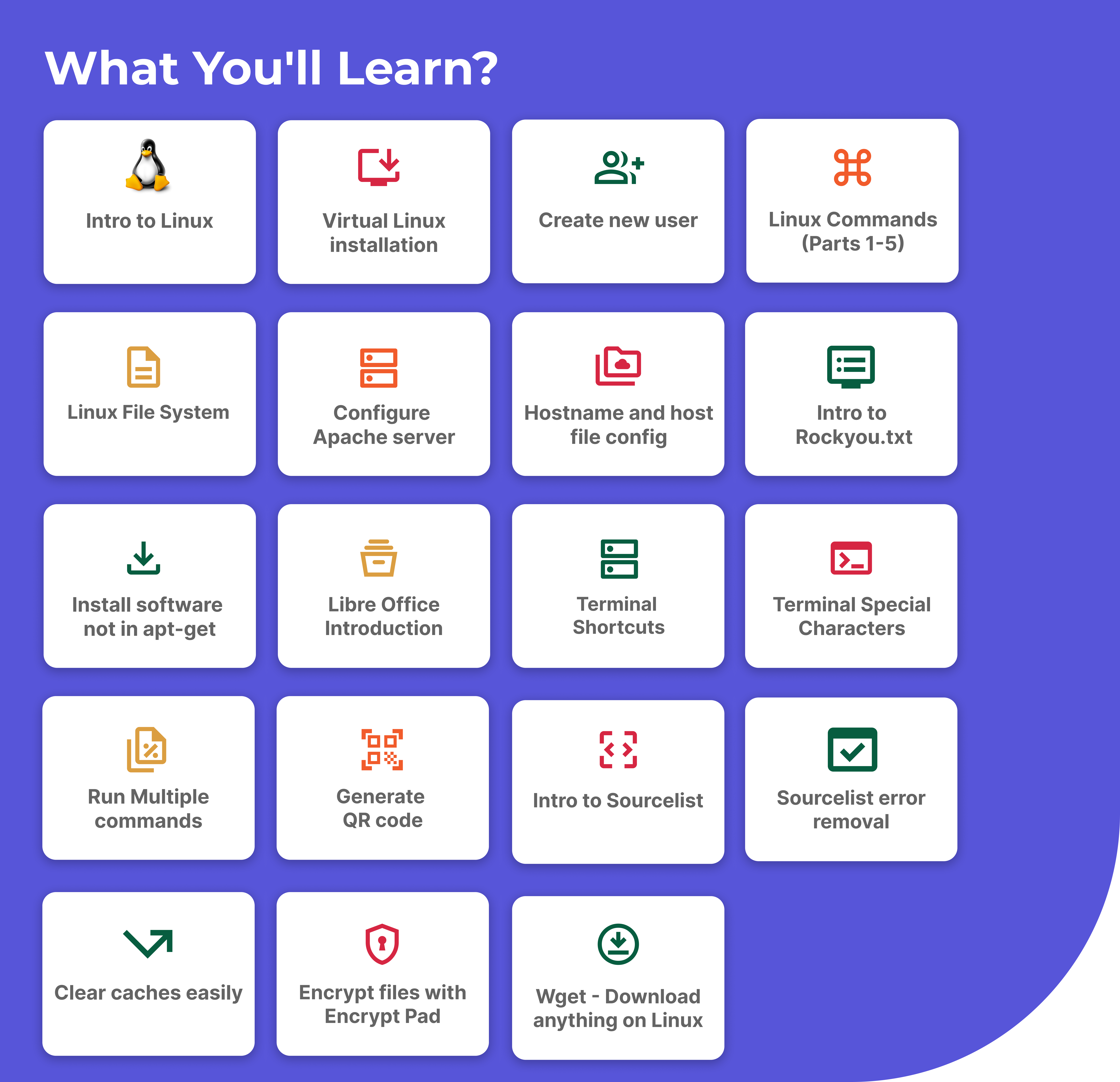 These are just the highlighted and important topics. The complete Linux Course includes numerous more modules that make you a master in the field.